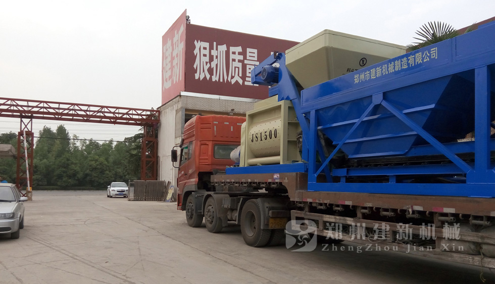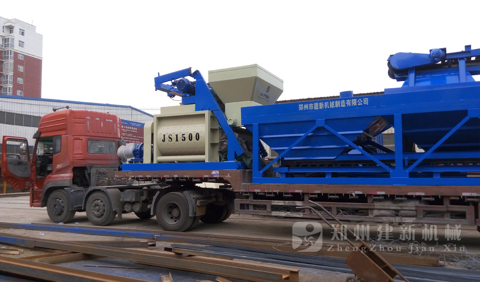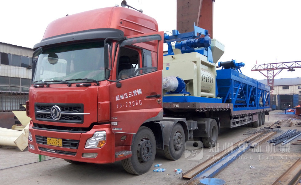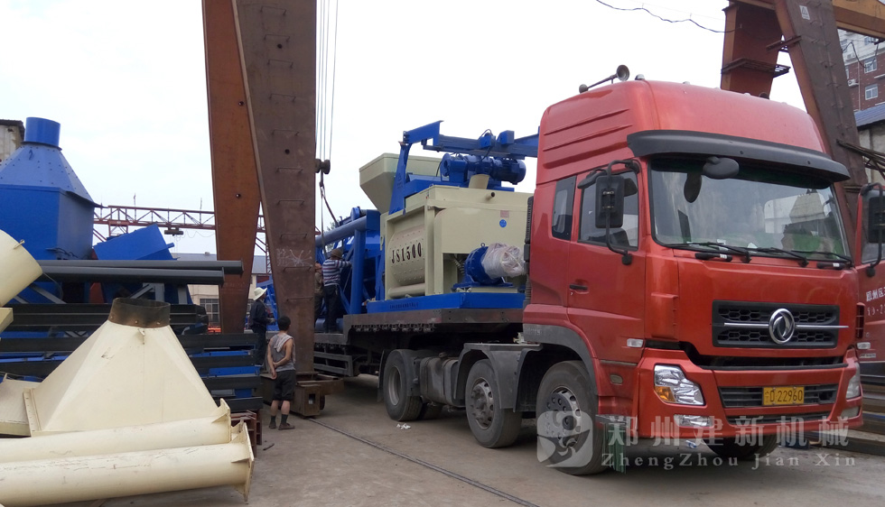 2015年7月13日,鄭州建新再發(fā)一套HZS75混凝土攪拌站設備,發(fā)往甘肅省。圖為JS1500混凝土攪拌機以及PLD2400混凝土配料機裝車過程。